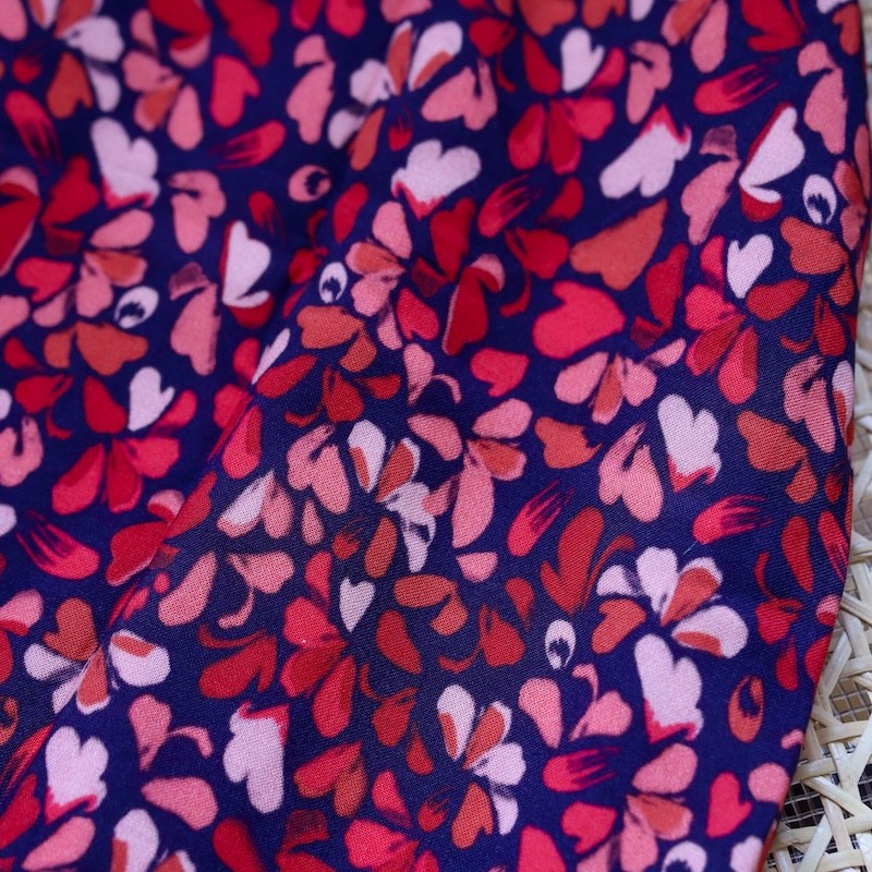 Tissu viscose dans l'imprimé "Scintille" de la marque française Lise Tailor. Un imprimé représentant un éclat de fleurs en cœurs, aux teintes vibrantes de rose, rouge et corail sur fond bleu nuit, comme un bouquet né de l’orage : la beauté lumineuse que la pluie révèle.