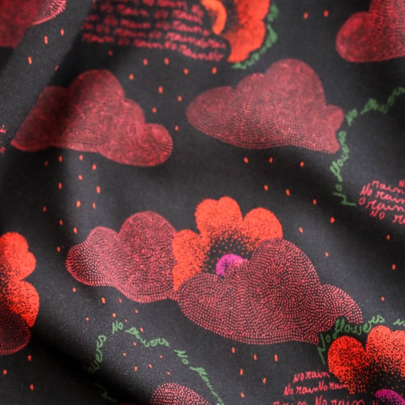 Tissu viscose dans l'imprimé "Celestial" de la marque française Lise Tailor. Un imprimé qui représente des nuées de points comme une pluie fine esquissent des nuages, porteurs d’une promesse : no rain, no flowers. Parce que c’est souvent de la pluie que naît la beauté.